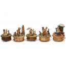 5 Thorens Musical Boxes with Erzgebirge Carvings, c. 1960