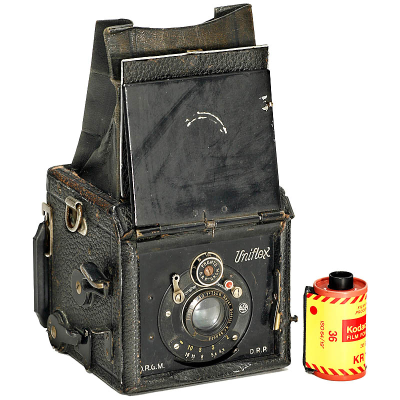 Schmitz & Thienemann, Tharandt. SLR camera, for plates 4.5 x 6 cm, with rare Trioplan 4.5/7.5 cm in Pronto shutter. – Rare camera!