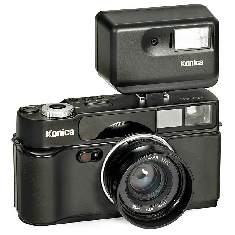 Konica, Japan. 35mm-autofocus camera, Hexar 2.0/35 mm, flash HX-14, strap and instruction manual. With box.