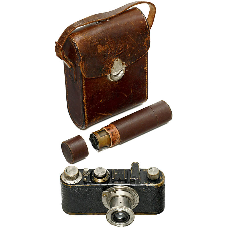 Leitz, Wetzlar. No. 71075, standardized lens mount, relevant brassing, technically excellent. Elmar 3,5/50 mm, nickel, no infinity lock. With ETRIN case, and two cassettes in cardboard tube.