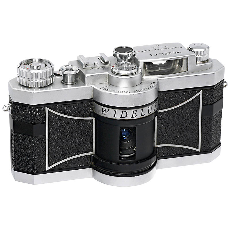 Panon, Japan. Panoramic camera for 24x59mm images on standard 35mm film, superwide-angle 140°, Vistar 2,8/26 mm, 3 shutter speeds 1/15, 1/125, 1/250 sec. Small dent at baseplate, otherwise near mint condition, sought-after user's camera, with case. Model FI is a very rare variant!
