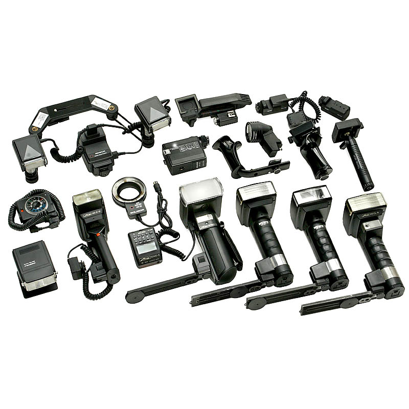Metz flash untis: 50MZ5, 45CL4, 2 x 45CT1, 32CT3, 32Z-2; lots of accessories, SCA adapters and more. Not tested. – And: 16 Cullmann aluminum cases (various), 3 Contax bags, 6 Leitz cases, 2 aluminum cases and more!
