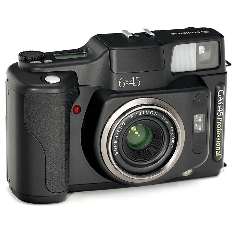 Fujifilm, Japan. Professional wide-angle rollfilm camera for film type 120/220. Autofocus, built-in flash, motor drive, Fujinon 4/60 mm. – With instruction manual, case, chain and 3 filters. – Camera working!