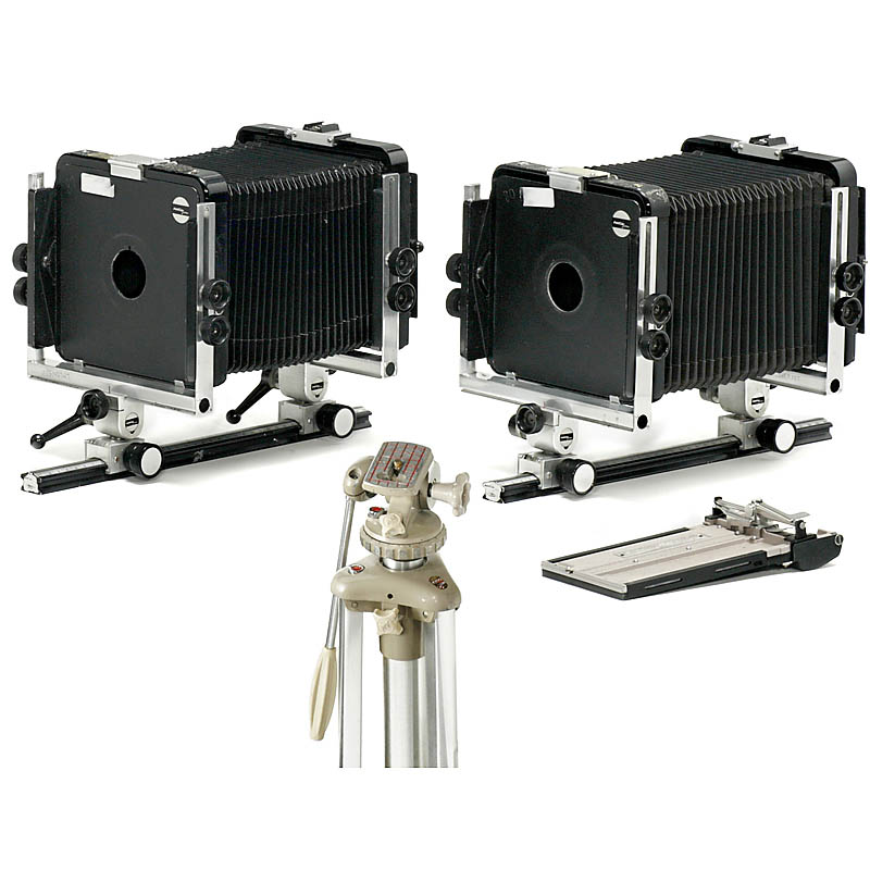 Arca Swiss, Zürich. Both cameras with ground glass back, and lens panel with 42mm diameter hole. – Add-on: Polaroid 500 cassette and Linhof tripod.