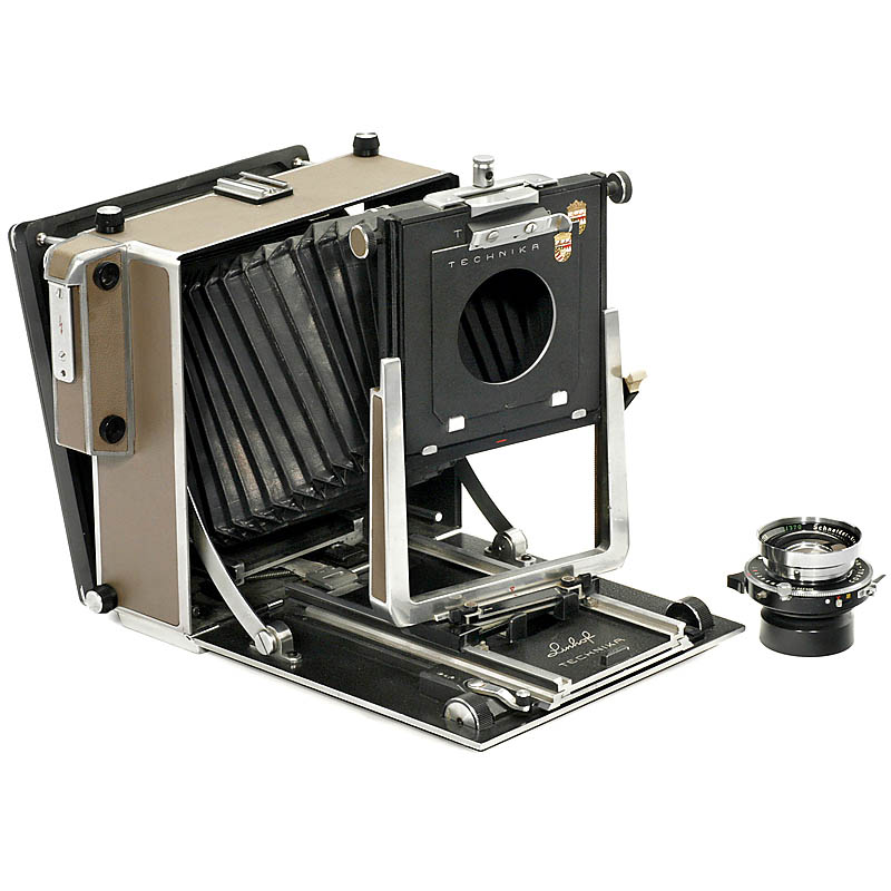 Linhof, Munich. Super Technika 13 x 18 cm, no. 2411062, with 9x12cm focusing screen back, rangefinder working. With Schneider Symmar 5,6/210 mm to 13/370 mm in Copal No. 1 shutter (without plate).