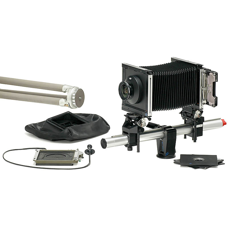 Sinar, Switzerland. Sinar F with Schneider Super-Angulon 8/90 mm (clean lenses, exellent condition) on special Sinar lens board, no shutter, for special aperture setting. With wide-angle bellows, base tube extension, Copal shutter board (8 sec. to 1/60 sec.), 3 lens boards, and padded case. – Add-on: 3 double film holders, and Polaroid no. 500 film holder. Linhof tripod.
