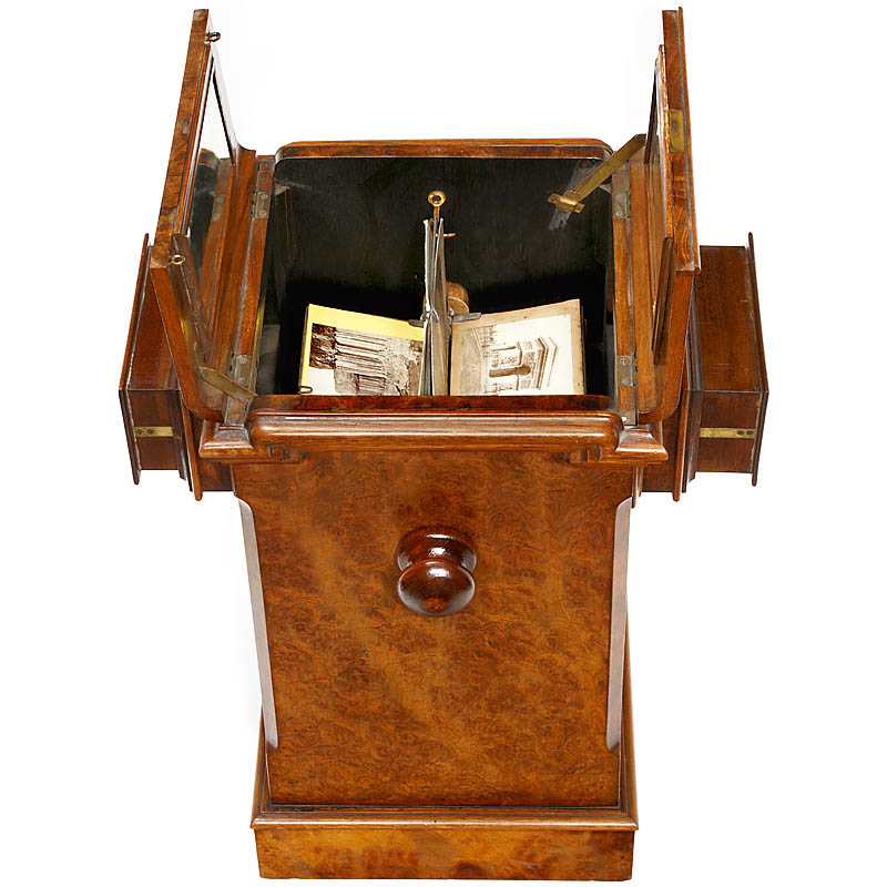 Presumably Stereoscopic & Photographic Company, London. Inside marked: "Best. Walnut Revolving Stereoscope, J. Spencer, 39 Union St., Glasgow." Complete with 84 stereo cards 9 x 18 cm, unusual stereoviewer with 2 individual focusing eyepieces for 2 observers! – Very rare and attractive exhibition piece and desirable collector's item in excellent condition and good working order!