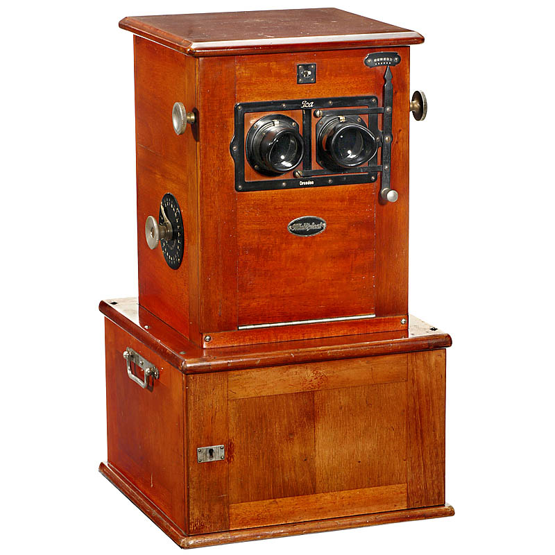 Ica, Dresden. For 45 x 107 mm slides, tropical wood, nickel fittings, height 20 in., with 13 magazines (Taxiphote – identical construction as Multiplast magazines) and 22 slides. – In working condition! Extremely rare!