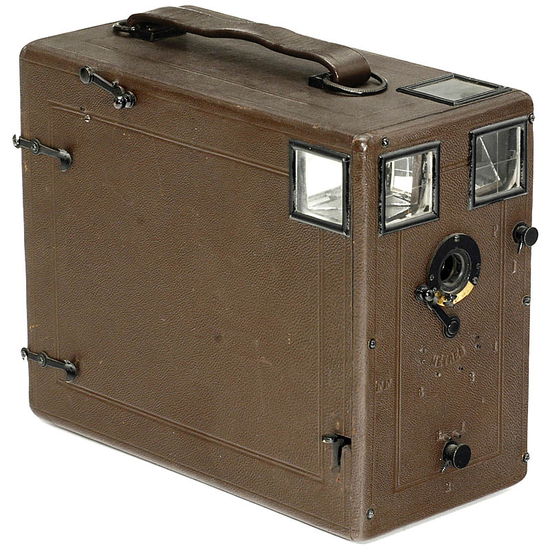 Unmarked, format 8 x 12 cm, drop-plate mechanism, wooden body with brown leather covering, I. + P. shutter, iris diaphragm.