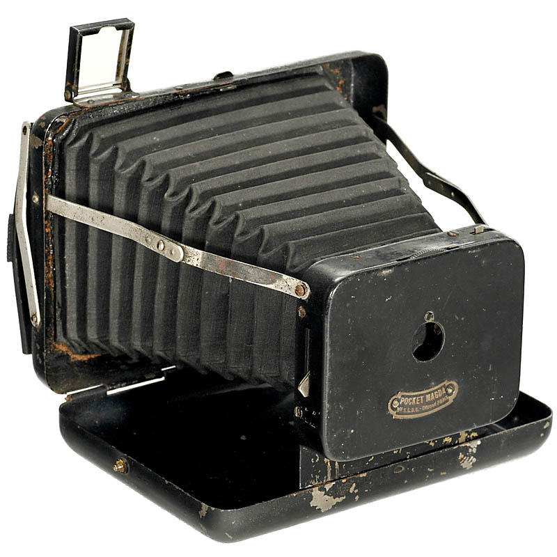 Magda, France. Compact French all-metal folding camera, for plates with size 6,5 x 9 cm, meniscus lens, simple shutter.