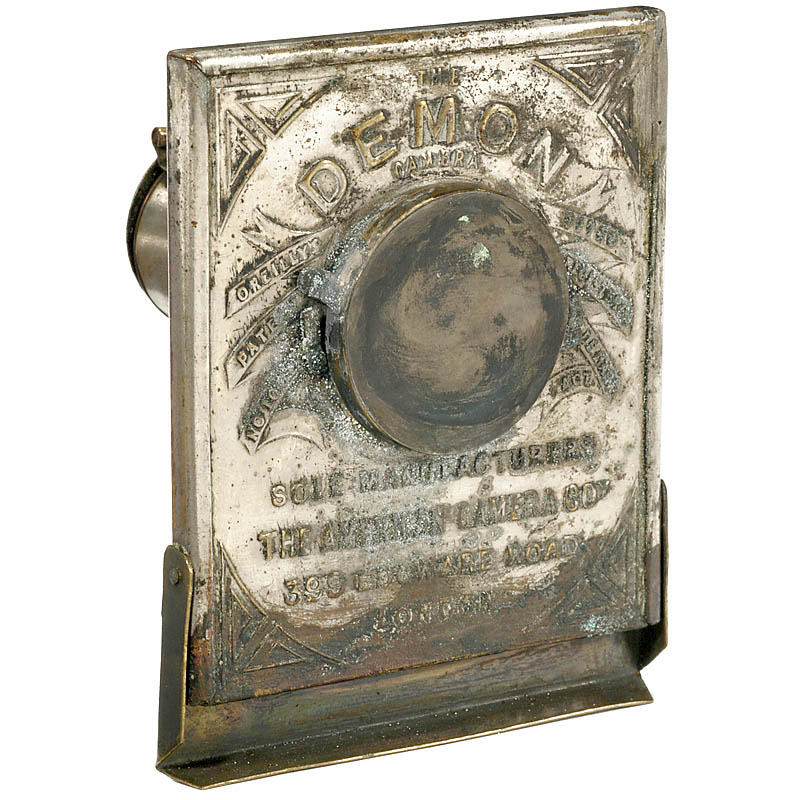 The American Camera Co., 397–399 Edgware Road, London. Originally introduced in 1889 for 2 ¼ in. diameter photos on 2 1/3 x 2 1/3 plates, single round exposures. "The striking design of the back stamping (by W. Phillips) makes the back view more interesting than the front view of these cameras." Unrestored original condition! – Literature: McKeown's Price Guide 2005/06, p. 50, and Michel Auer, "Kameras gestern und heute", p. 91.