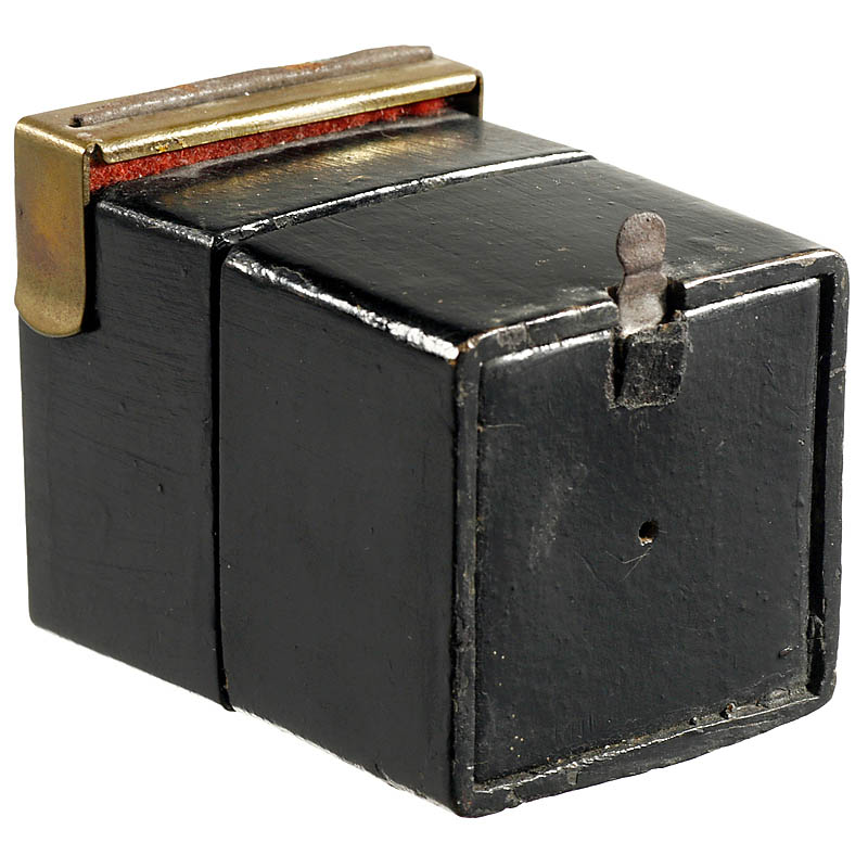 Subminiature box camera by L. F. G. & Co., Paris, for 4x4cm plates, meniscus lens, simple shutter, lacquered wooden body, and 3 original plates. With darkroom items: lamp with red filter, developing bowl, dry rack and original fixing bottle. – Very rarely to find so com-plete!