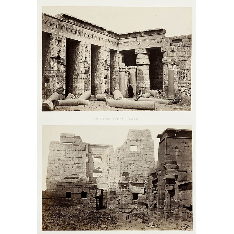 10 photographs (size approx. 6 ¼ x 9 in., on cardboard 13 x 17 1/3 in.) from the series "Lower Egypt, Thebes and The Pyramids" Part I up to Part XII: 1) The Statues of Memnon. – 2) Travellers boat at Ibrim. – 3) The Mosque of the emeer Akhoor. – 4) Cairo from the east. – 5) Tombs in the southern cemetery. – 6) The Mosque of El-Hakim, Cairo. – 7) The Ezbekeeyeh, Cairo. – 8) Interior court Habou. – 9) The temple palace, Haboo. – And: 10) Pylon gateway at Medinet-Habou. – Partly with original accompanying text.