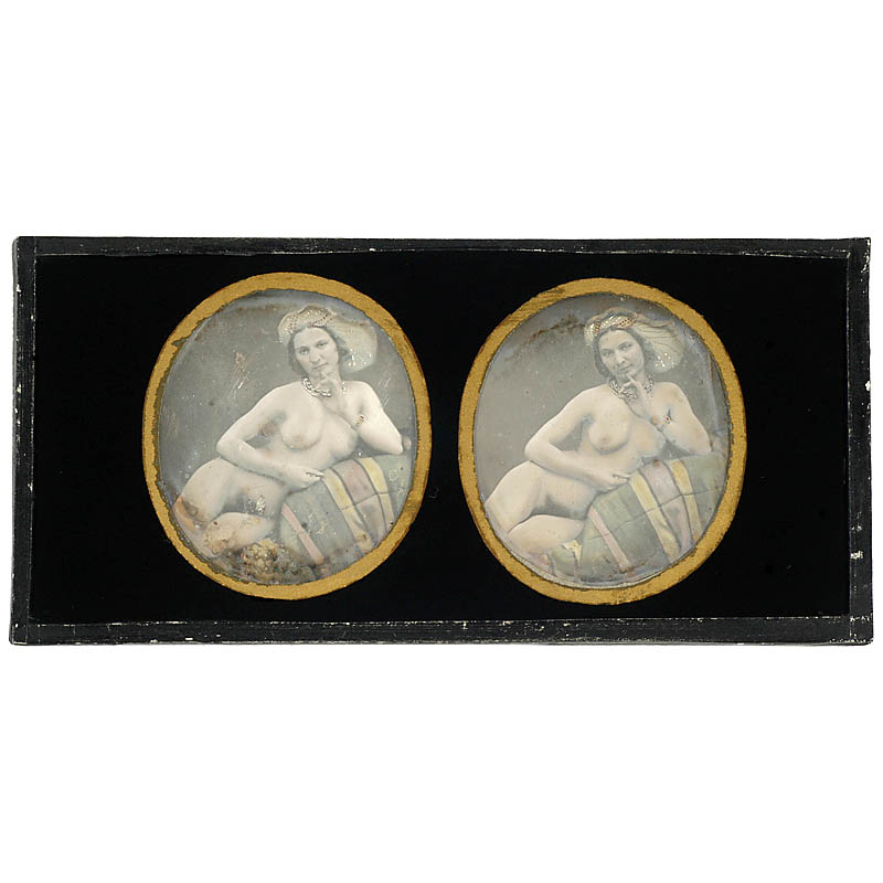 Completely hand-colored, female nude, leaning on chaiselongue, hat and necklace with gold color! French made. Size 8 x 17 cm (3 1/6 x 6 ¾ in.), excellent condition! – Very beautiful daguerreotype!