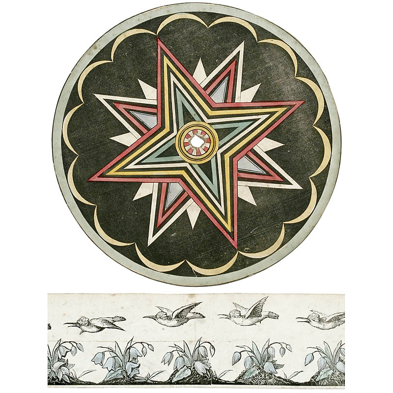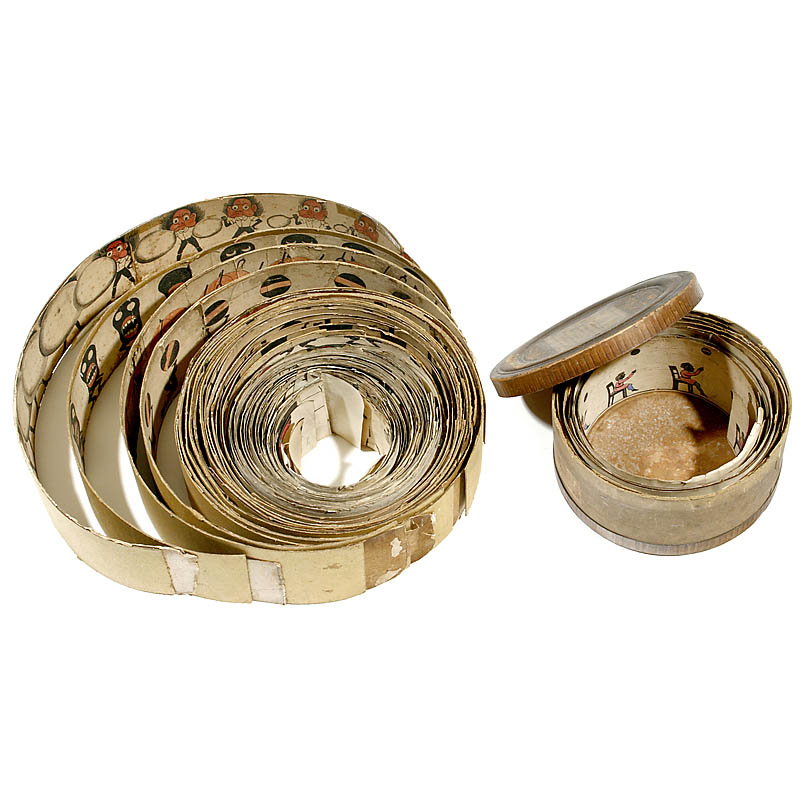 A professional demonstration zoetrope with approx.. 40 paperstrips and one animation strip. Ø approx. 10,5 in. The Zoetrope is 12,2 in. high and the drum has Ø 11,5 in.