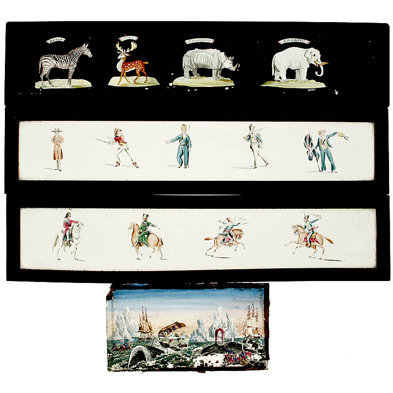 3 wooden framed slides 3,8 x 16,8 in. Fine paintings. – Add-on: 1 slide 4,0 x 7,1 in.: "Whaling". Interesting motif with damage.