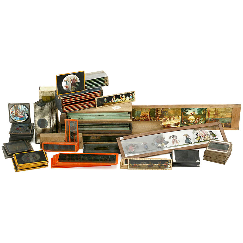 Various series and sizes. Many hand-painted early motifs. 6 mechanical slipping slides in tin frame. – Very interesting material!