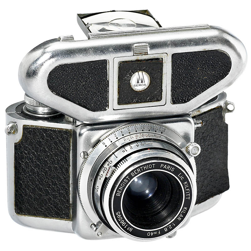 S.E.R.O.A. Mecaflex, 1958, 由 Kilfitt 设计, Prontor-Reflex 快门, Berthiot/Kilfitt Kilar 2.8/40mm. 部分皮饰脱落, 罕见!