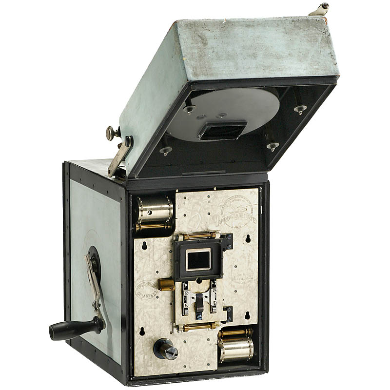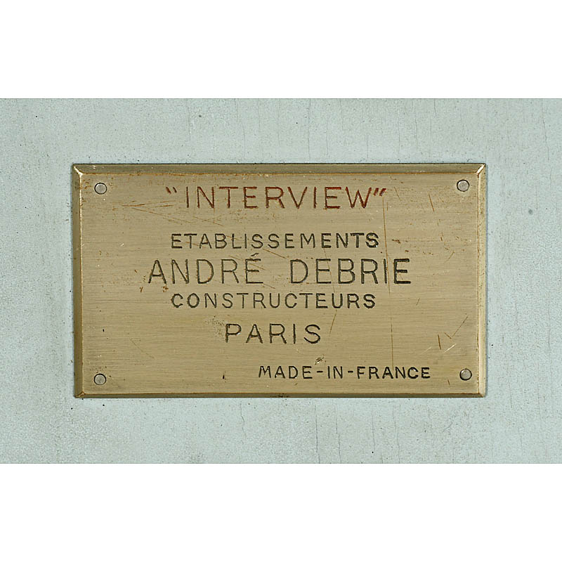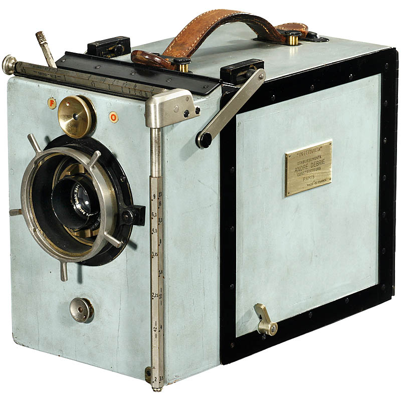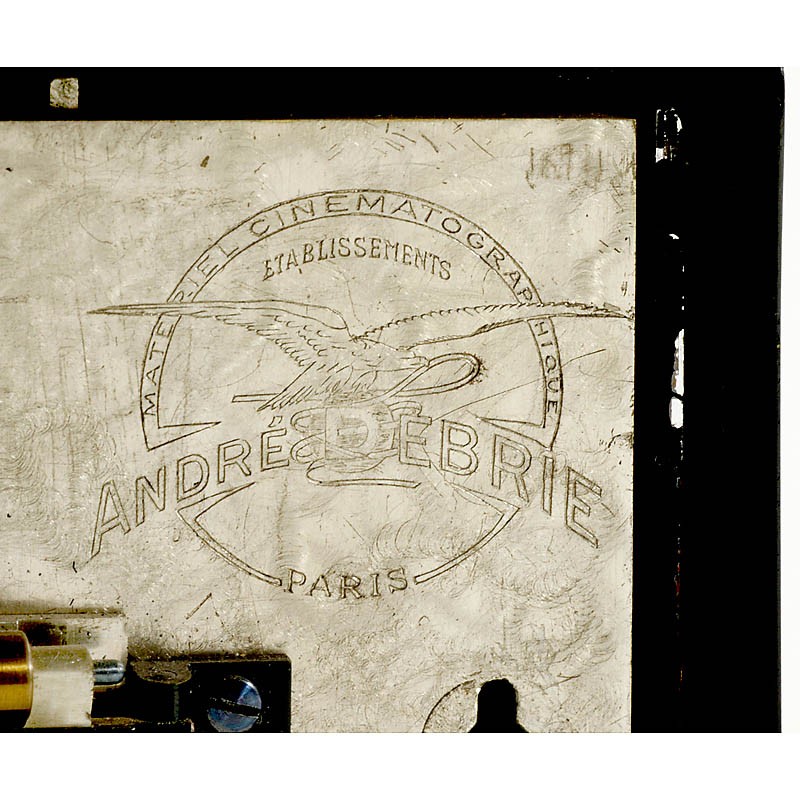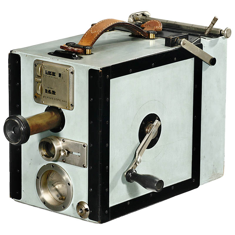 Serial no. 655, manufactured by "André Debrie, Paris", Astro Tachar 1:1,8/40 mm lens, direct vision optical viewfinder, handcrank or electric motor drive. With the following accessories: Flexible shaft for external drive and matte box with filter holder.