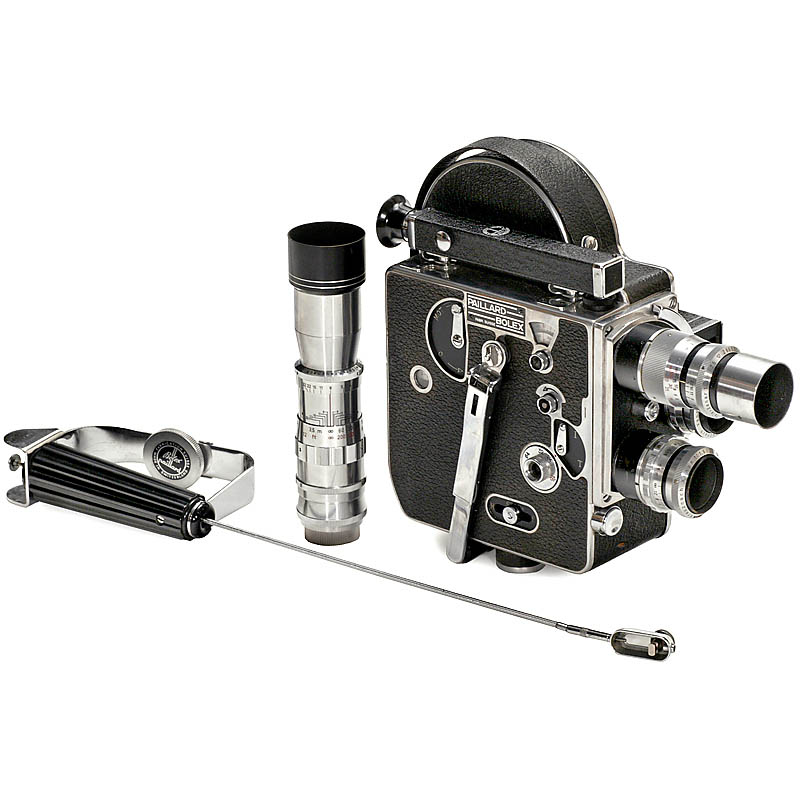 1)Bolex H16, clockwork, 3-lens turret with Schneider 1:1,6/16 mm, 1:1.5/25 mm, 1:3.8/75 mm lenses and 1:4,5/150 mm lens, with original Bolex box and grip.