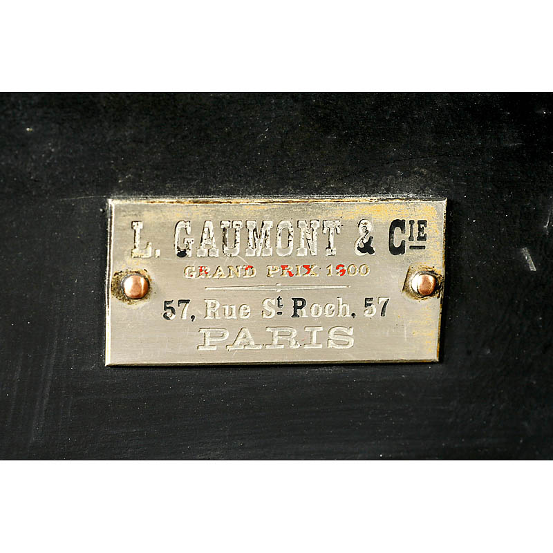 Manufactured by "Gaumont & Cie, Paris", table projector for 35mm film and 8.5 x 10.5 cm glass slides, projection head with 2 brass lenses (Cindo and Hermagis, Paris), handcrank-operated, original Gaumont lamp house, table renewed, serial number on the projection head 20675.