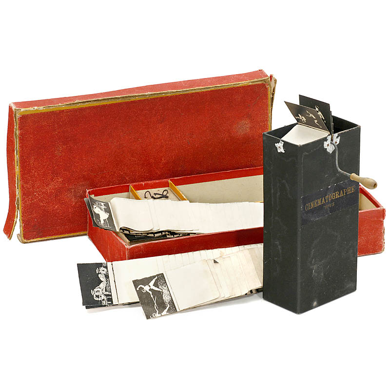 France. Cardboard box, continuous paper ribbon with 46 pictures, crank, height 6 ½ in. With the original ball weight and 4 paper ribbons. Original packaging, with minor damages. – Literature: ACR 822. – Good condition.