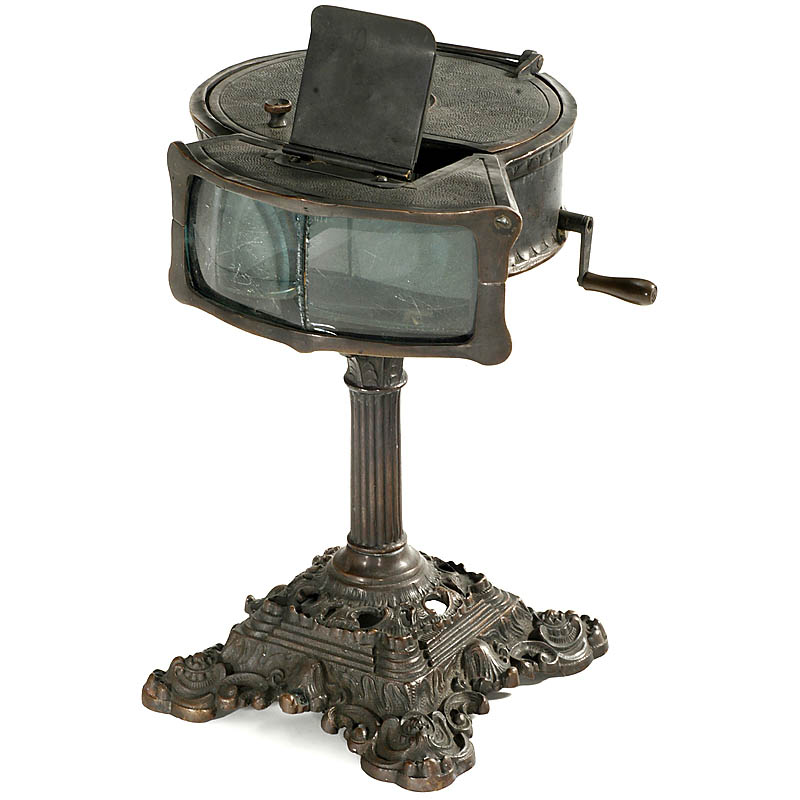 B. M. & Biograph Co. Ltd., London. Home movie machine for 2 persons, 2 lenses, bronze case and stand, operated by hand, with one reel (Dancing girls), working, excellent original condition. Very rare! – Literature: Freeman/Sayer, "Victorian Kinetic Toys", 1977, p. 64.