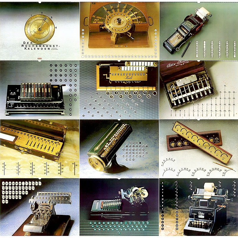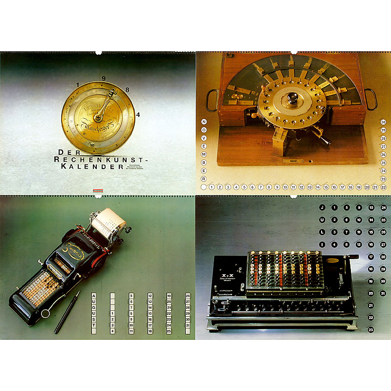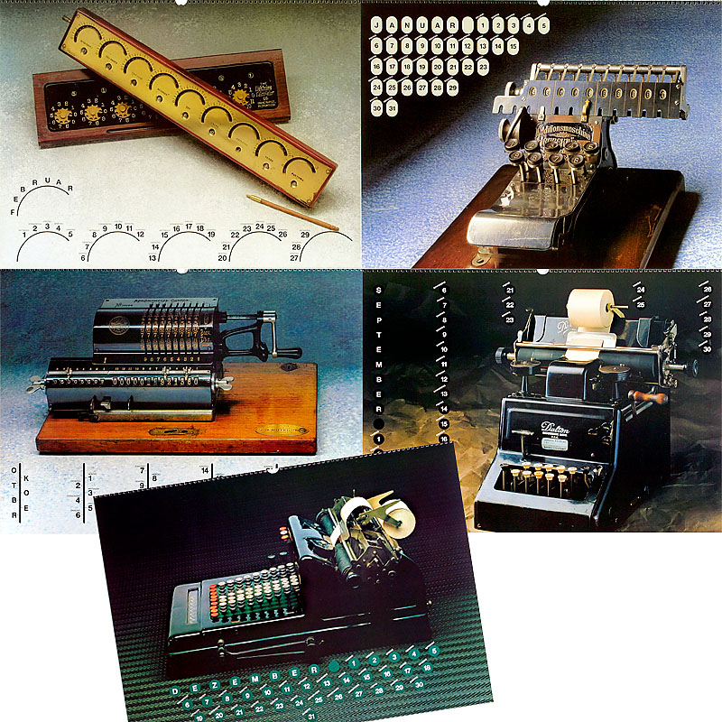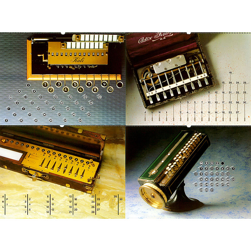 Famous and highly awarded 1984 calendar with 12 posters of beautifully designed rare calculating machines of the pre-computer era, i.e. "Edmonson's circular calculating machine", 1883. – Size: 25 2/3 x 19 in.