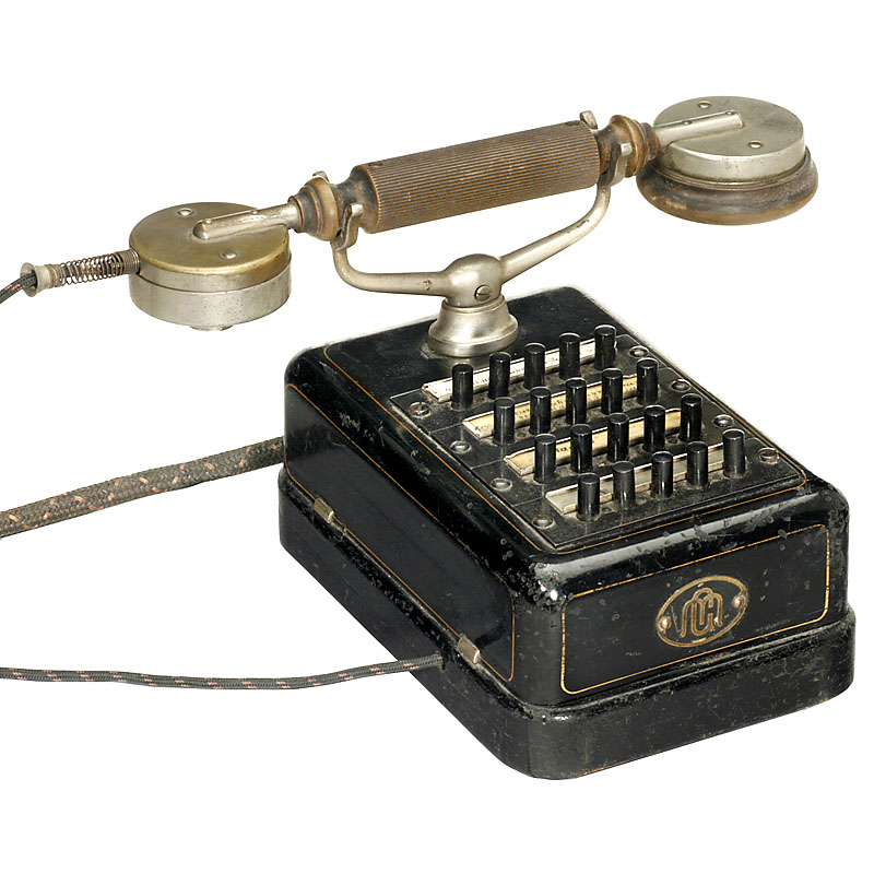 Company or home telephone, marked "GM", painted metal case, handset without horn.