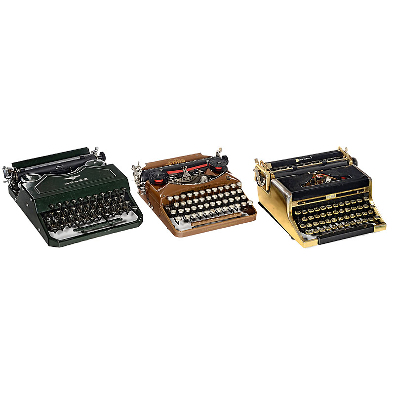 3台色彩不一的打字机("Royal Quiet Deluxe" (金色), "Erika Mod. 5" (棕色), "Adle