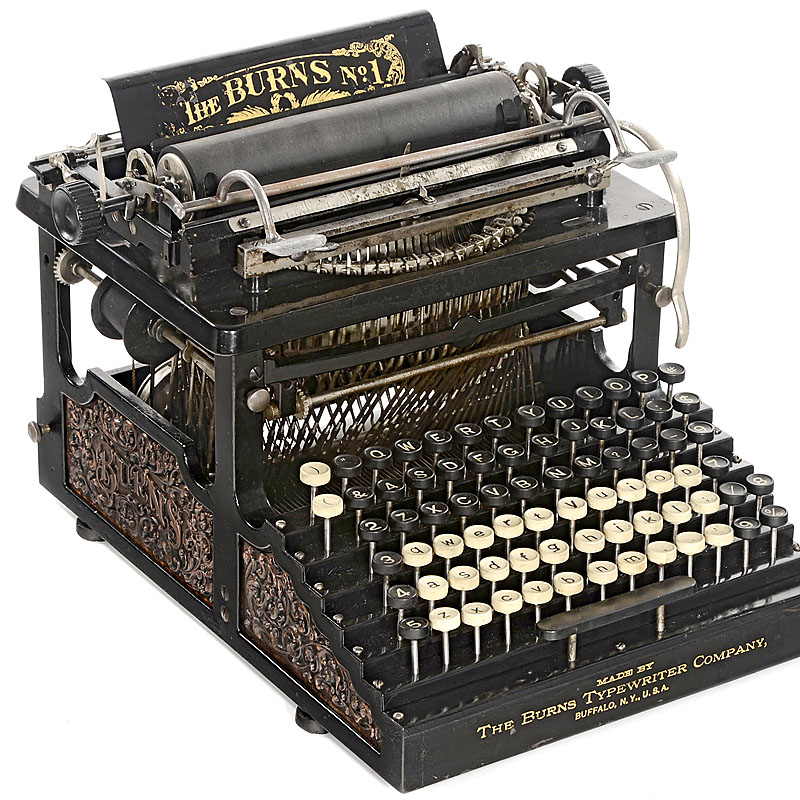An extraordinarily rare American upstroke typewriter with full keyboard by Frank Burns. Made by The Burns Typewriter Company, Buffalo, NY. In 1895 production ceased, after just one year. Serial no. 3!