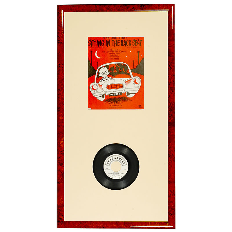 Original vinyl disc with original music sheet of the famous British automobile song of 1959, costly framed under glass (17 1/3 x 33 in.).