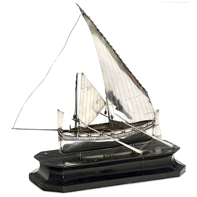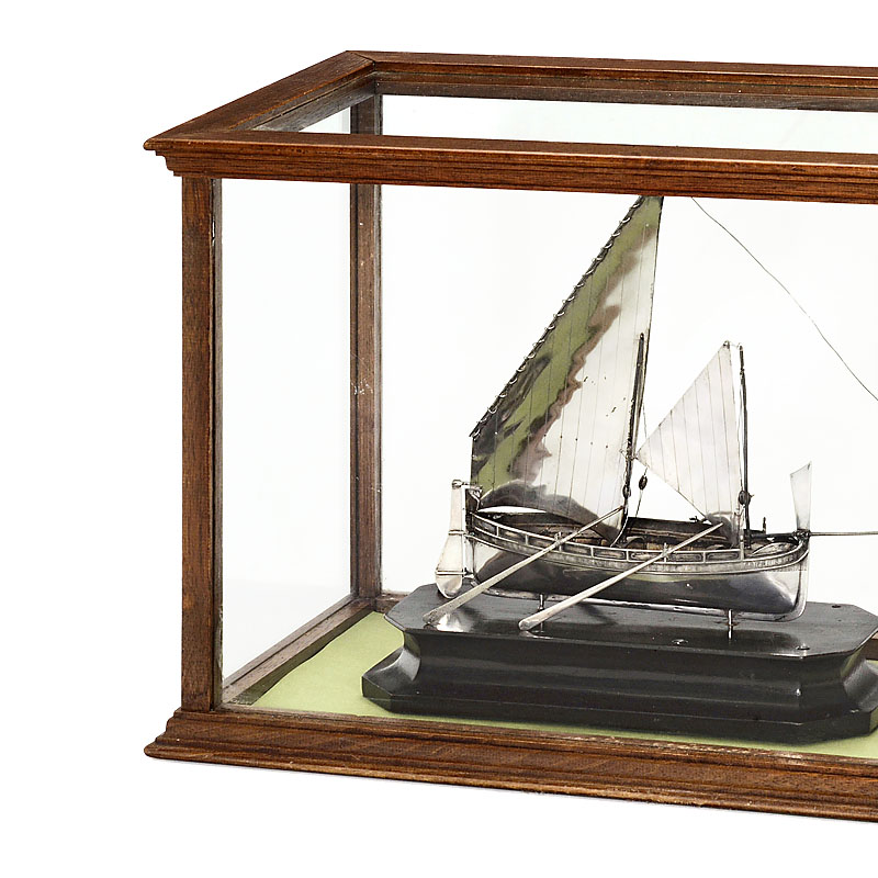 Probably Dutch, 800 silver, al parts with hallmarks, height 9 7/8 in., on wooden base in glazed showcase.
