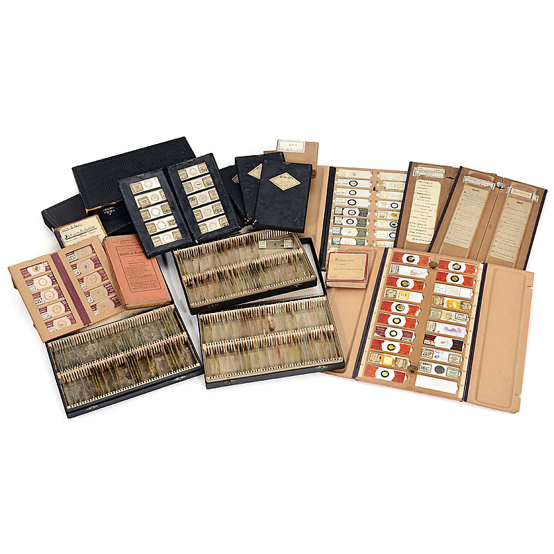 In boxes or folders; with vegetable, animal and human preparations, all with descriptions, manufactured by: "Schlüter & Dr. Mass, Halle", "Mikrokosmos, Stuttgart", "Franckh-Verlag, Stuttgart" and other.