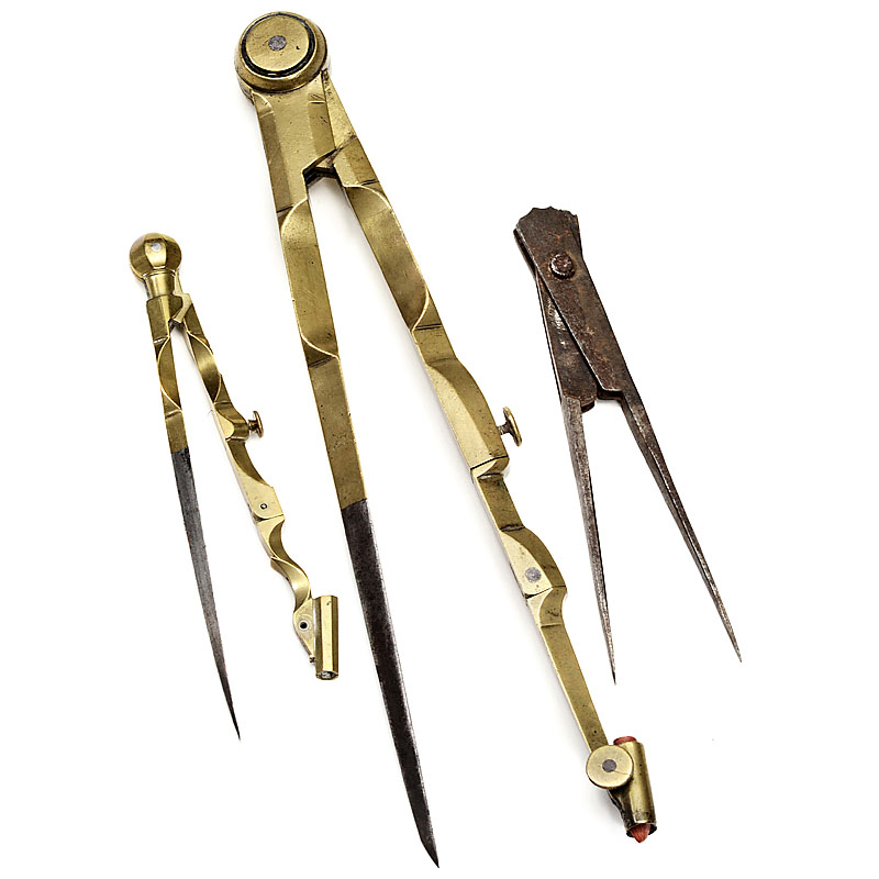 1) 2 pairs of drawing compasses, for blackhead use, brass and iron, lengths 5 ½ and 9 ½ in.