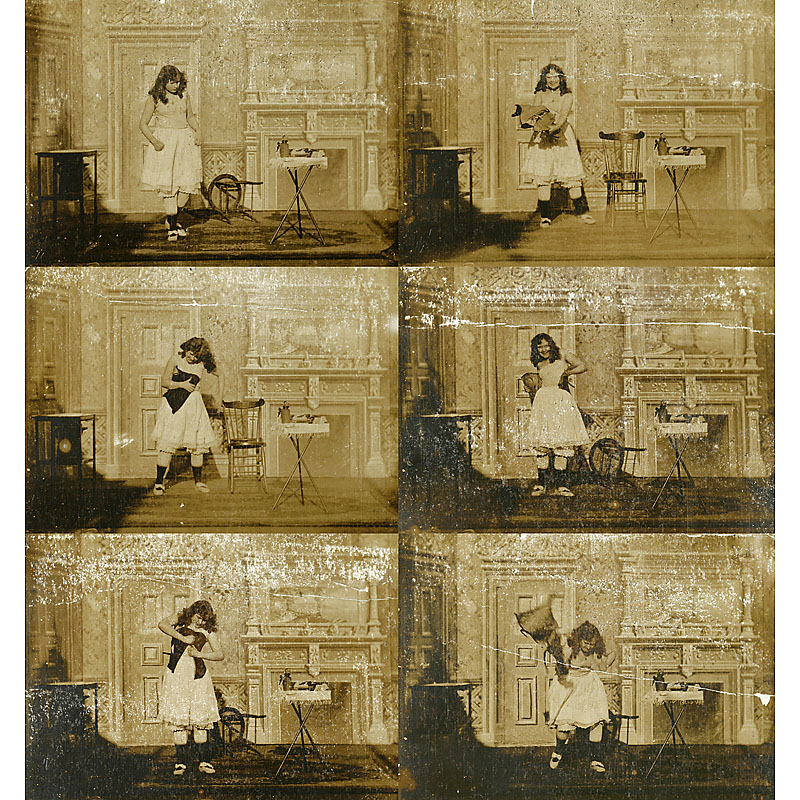 Exceptionally rare table model of early Berlin production, with wonderful decorative art-nouveau motif on both sides. Probably from the very first and only prototype series as nearly nowhere else known. With original Mutoscope reel "Anger about the undersized corset". Marquee sign probably later.