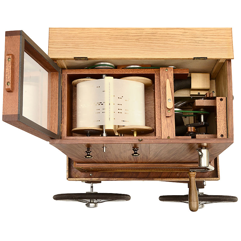 Paper roll organ, 24 notes, handcrank-operated, wooden case with inlays, size 16 ½ x 11 x 21 in., very good playing condition, on matching cart, with cover and 7 rolls.
