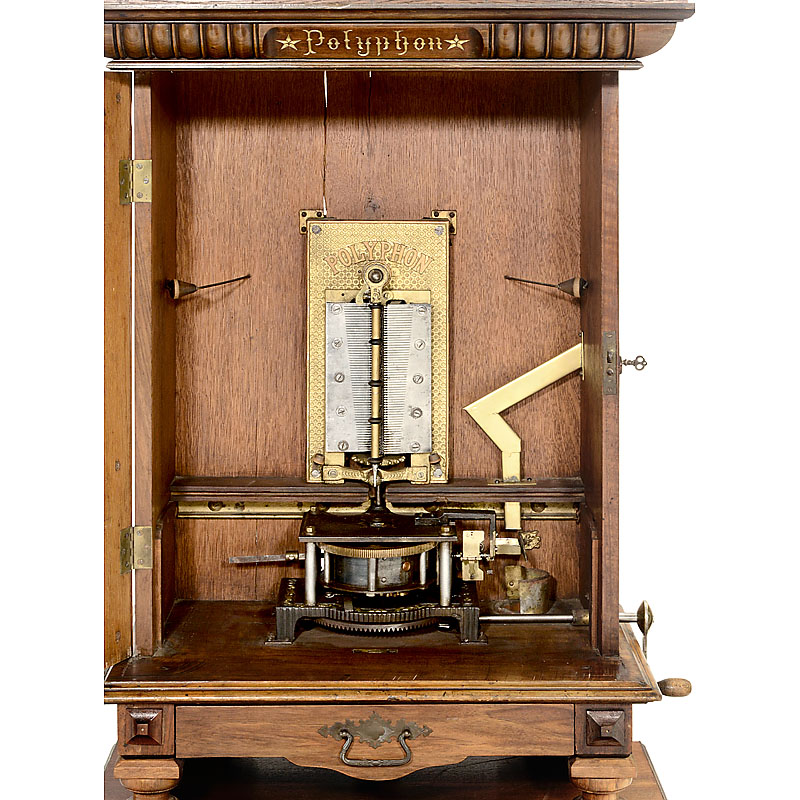 For 19 5/8 in. discs. Manufactured by "Polyphon Musikwerke, Leipzig", coin-operated, 118 teeth in duplex comb (complete!), upright walnut case with base cabinet! Gallery,