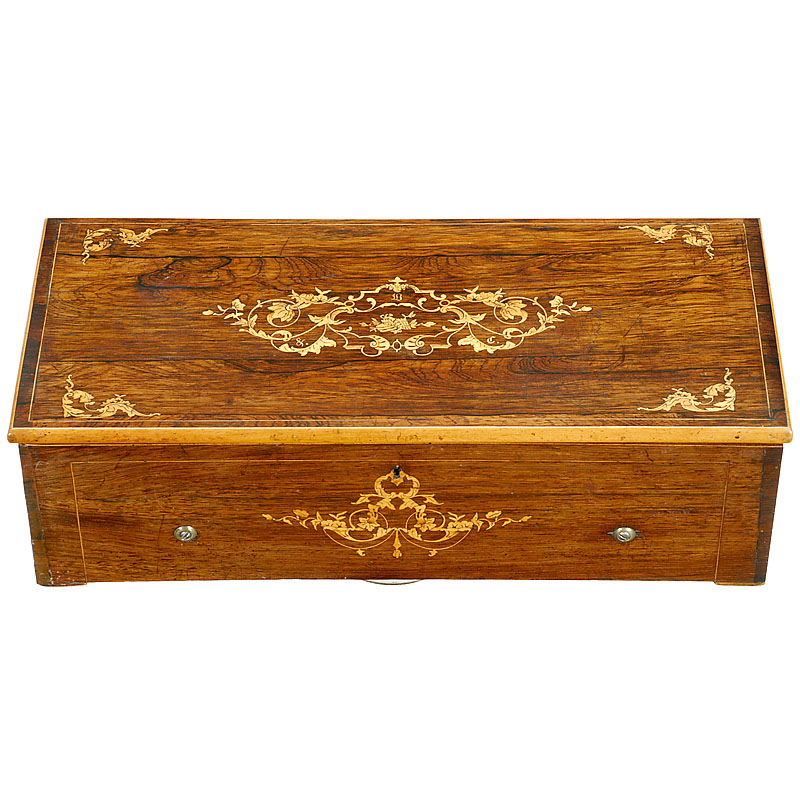 With 108 comb teeth (complete), instant-stop and later brass plaque, the brass bedplate stamped with nos. "12505", "3" and foundry mark, the cylinder stamped "12503" in rosewood veneered case with endflap, burwood interior, inlaid front and lid featuring the initials "B&C" within the design, 18 ½ in. wide, cylinder 11 x 3 in. diameter. The musical program is fairly unusual; the 1st track appears to be an operatic motif in two parts. The 2nd track is an overture (probably "Don Giovanni") played in one complete revolution. The following 4 revolutions play 8 airs two-per-turn. The movement has been overhauled, including a repin and a professionally re-cut great wheel. The music is well arranged, albeit now in need of some fine tuning and adjustment. The case has retained its attractive original finish. Overall, an impressive early cylinder musical box.