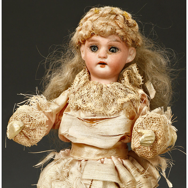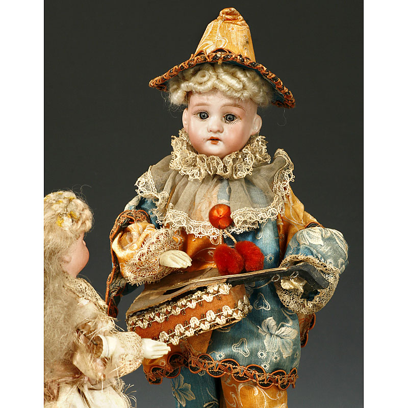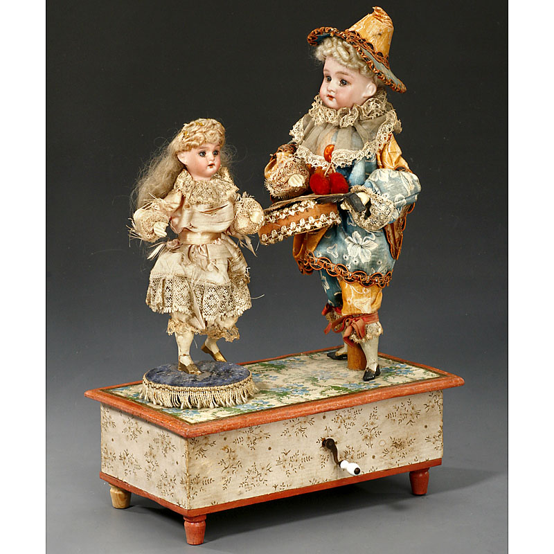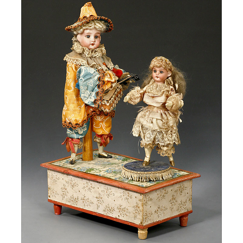 Both figures with bisque heads and open mouths, fixed blue glass eyes and original mohair wigs, the musician strumming a guitar as the dancer turns in a circle, girl in original satin costume, musician suitably redressed in antique silk brocade, on paper-covered base containing hand-turned cylinder movement playing one air, height 15 in. (38 cm), one replaced foot on base.