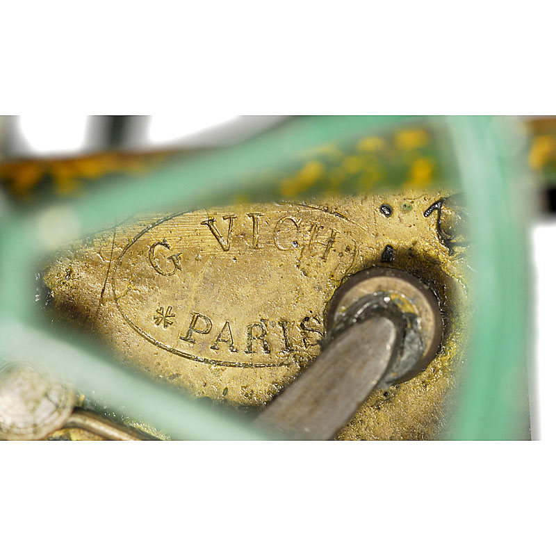 All-bisque doll with jointed neck and limbs, moulded shoes, open mouth with three teeth (two upper, one lower), fixed brown glass eyes, original wig and colorful satin costume, seated side-saddle on leather-covered cow, on green-painted metal base with 2 1/8 in. (5.4 cm) back wheels and motor stamped "G. Vichy, * Paris *", length 7 in. (18 cm) nose to tail, height 10 in. (25.5 cm), (minor wear to doll's costume). The girl bounces up and down as the cow rolls forward.