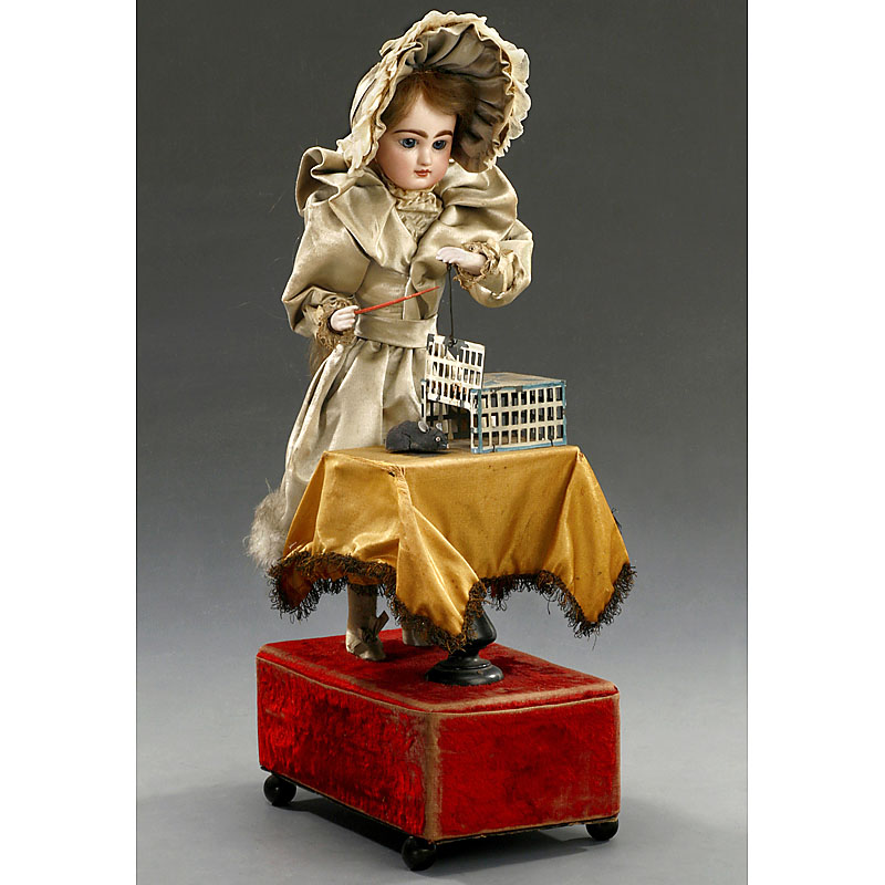 – The girl nods her head and beats time with the baton, as though directing her unusual pet who runs across the table, turns in a circle and then returns obediently to his cage when the hatch is raised. There is some usual wear to the table cloth edges and the girl's bonnet, but overall an amusing automaton featuring a beautiful bébé in very well-preserved original working condition.