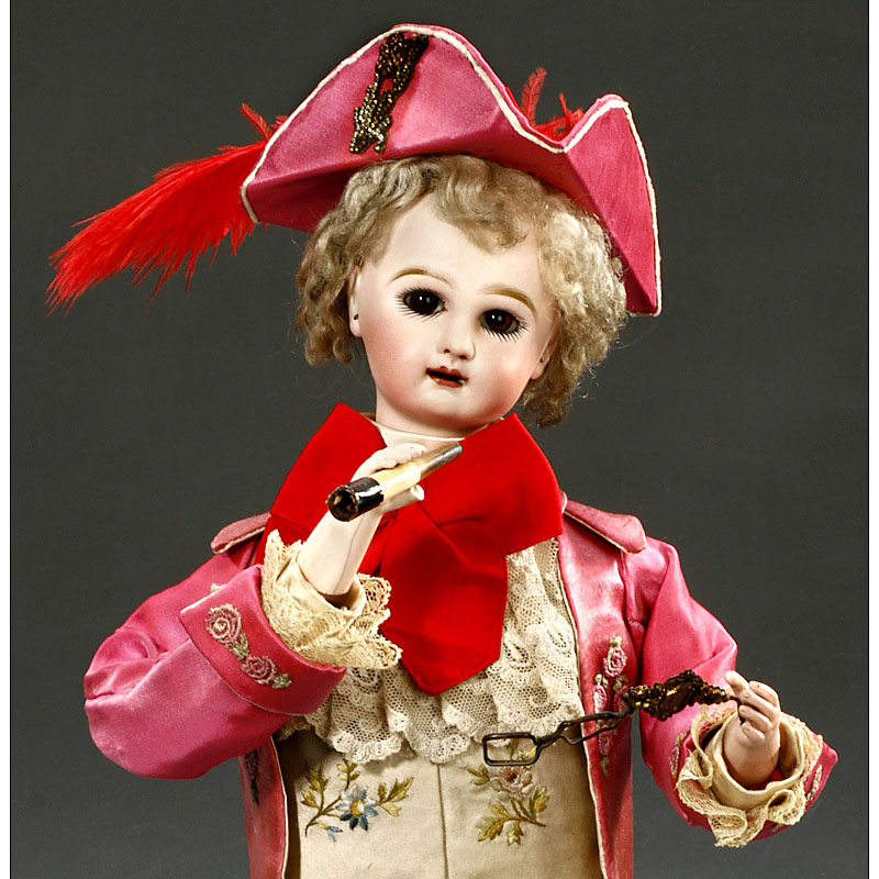 With Jumeau bisque head stamped in red "Déposé Tête Jumeau, Bte. S.G.D.G. 4" and artist’s marks "XM", open mouth, fixed brown paperweight eyes, light-brown feathered brows, pierced ears, original hand-tied curly mohair wig on cork pate, bisque hands holding lorgnette and cigarette-holder, going-barrel movement in the torso causing the Marquis to raise the cigarette to his lips three times, lift the lorgnette and tilt his head back to exhale the smoke (which is cycled from his right hand to his mouth via bellows) in a series of graceful motions, dressed in embroidered waistcoat and second generation raspberry satin costume with restored elements, height 24 ¾ in. (63 cm) including the hat, with early Lambert key and stop/start (hairline cracks on both hands, missing right thumb, cigarette-holder repaired).