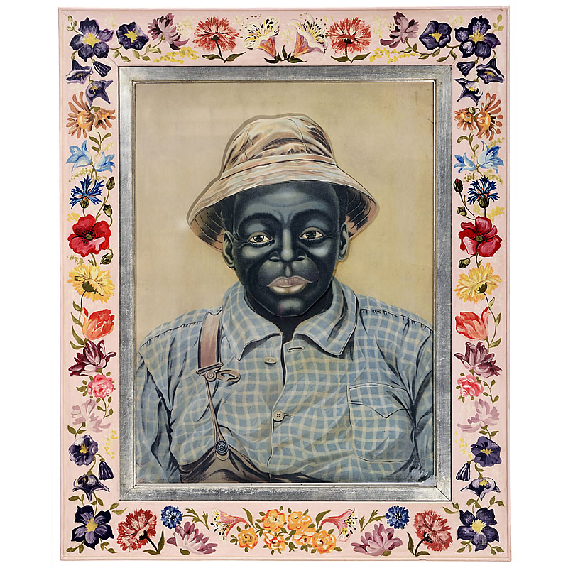 Large moving picture, electric drive (1,5 V), handpainted frame with blossom ornaments, size 18 ¼ x 27 1/5 x 3 ½ in. The black man changes his facial expression from friendly to angry and back. – Replica "Hoyt Life Picture".