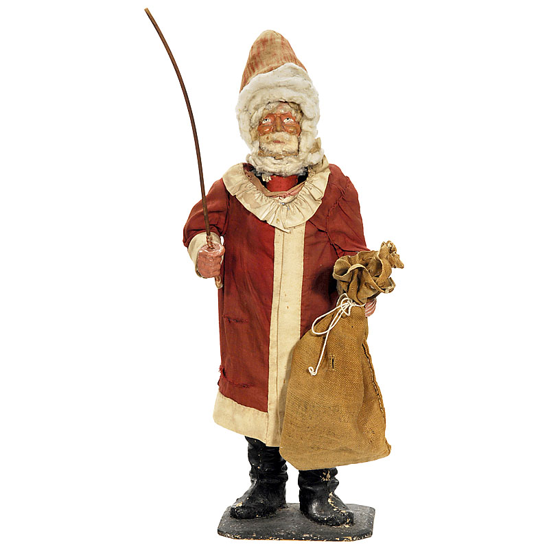 With articulated composition head, painted blue eyes, cotton-batting beard and hair, composition booted feet and hands holding rod and a sack, key-wind clockwork motor in card torso, original red tunic with white edging and later hat, on square wood base, height 31 in. (78 cm) to top of hat.