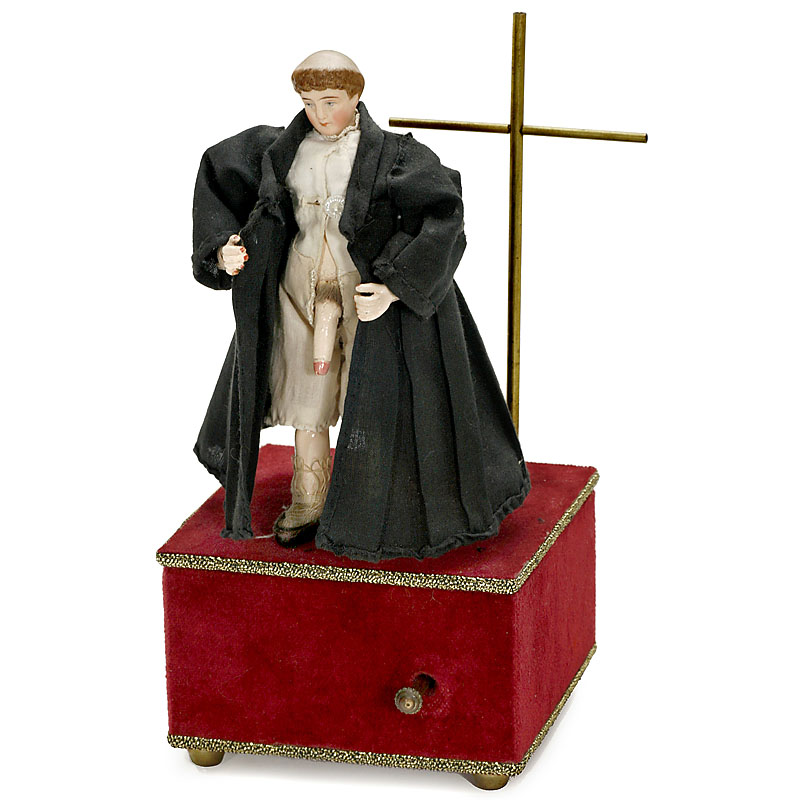 With antique bisque head modelled as a young man with serene expression, blue eyes and moulded tonsure, dressed in a floor-length black habit and underwear, standing before a winding key disguised as a brass cross, on velvet-covered base containing single-air cylinder musical movement, ht. 8 ½ in. (21,5 cm). A small automaton with a very surprising action. The monk raises his head and slowly opens his habit to reveal his manhood moving in time to the music.