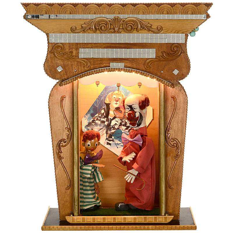 Mechanical amusement machine, with 2 puppets on strings, electric light and motor, size: 25 x 11 ½ x 30 1/3 in.