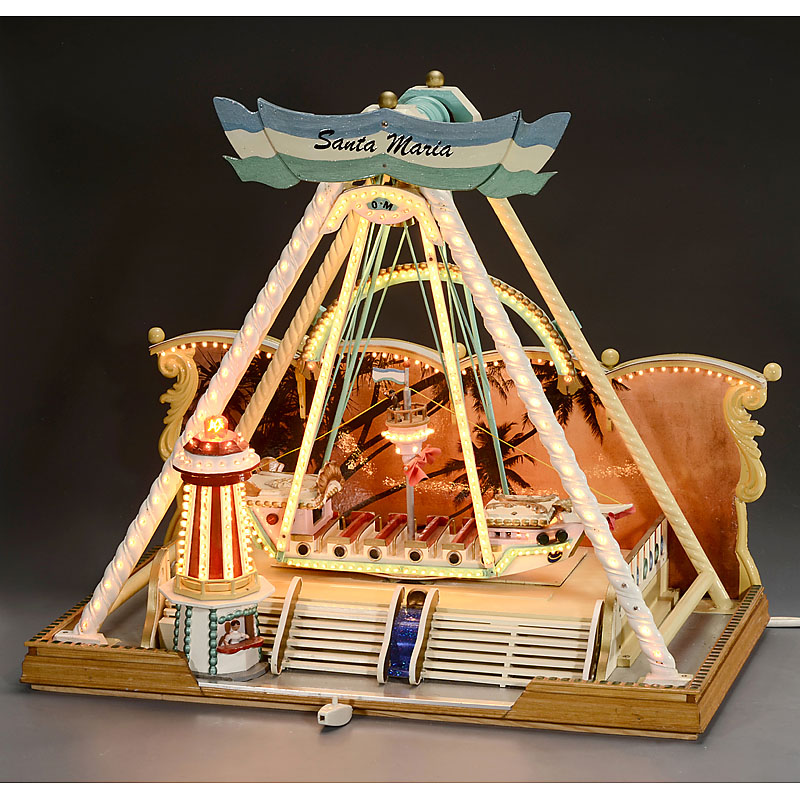 Large fairground model, with seated gondola and light house as ticket box; wood and metal, hand-painted, electric light and swing motor, size: 28 ¾ x 17 1/3 x 25 3/5 in.