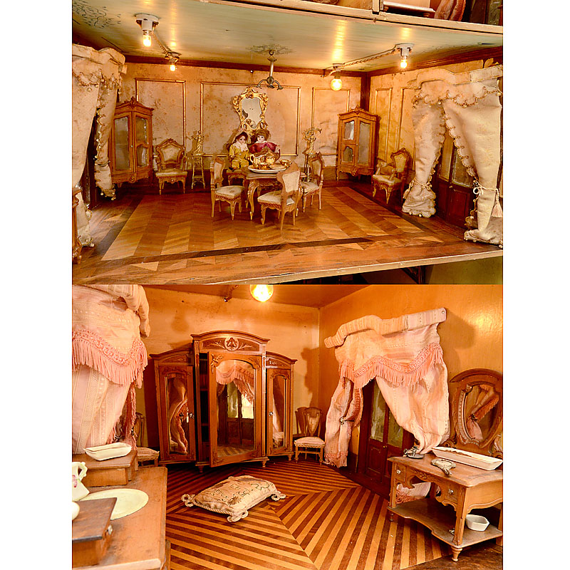 Magnificent doll's house from Cartagena, Spain, with 10 rooms and hallway, each room with parquet floor (all different patterns), electric light and bell (110 V), opening doors and framed windows. Panelled entrance, first floor hall way and staircase, family chapel with altar, study with library, lumber room, kitchen with sink and stove, bathroom with ceramic basins and tub, water closet and shower, dining room with Art-Nouveau furniture, salon with baroque furniture and silk wallcovering, nursery, bedroom, dressing room. – Exclusive furnishing and fittings: miniature oil paintings (some signed and dated), finely carved furniture, porcellain tableware, accessories made of filigree soft-metal, small sculptures, bird cage, mirrors, painted ceilings in the salon, chapel and dining room, velvet curtains, blankets and many more details. 2 bisque head dolls with glass eyes and 2 bisque head dolls: doll's house gentleman and chef. Size: 71 x 22 x 62 in.! Some balconies are restored, exterior probably repainted many years ago. Otherwise in good and all original condition. A unique piece – this kind is extremely rare and beautiful.
