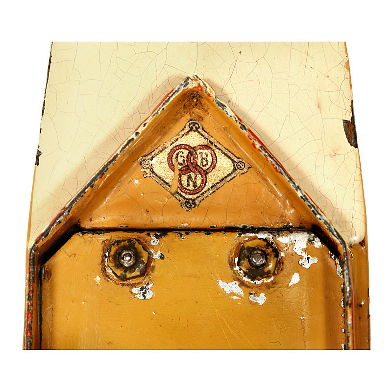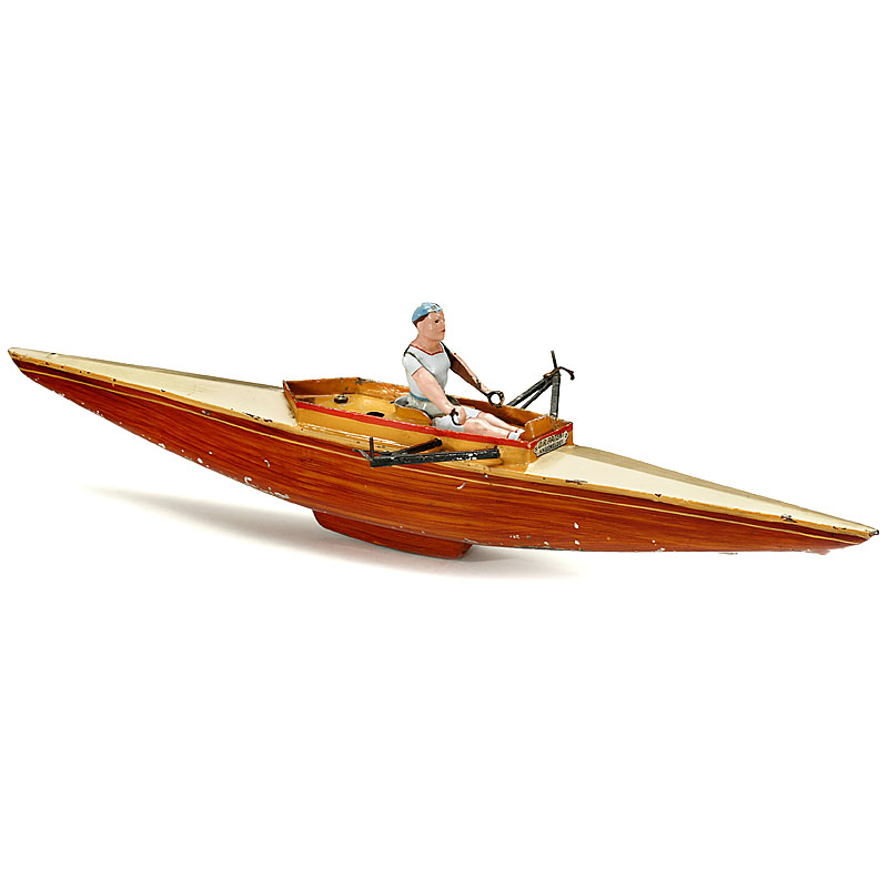 Handpainted tin, length: 20 in., no paddles, rudder and flag, clockwork (working), original paint, minor chips at bottom.